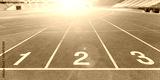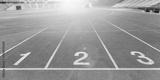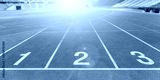 Running track race, racetrack in sport arena in athletic game event for athletes with stadium for audiences and fans background for competitive success and aiming goal concept