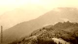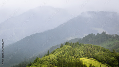 Scenic view towards mountains in mist from Miradouro do Pico dos Bodes, Sao Miguel island, Azores