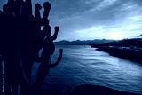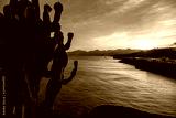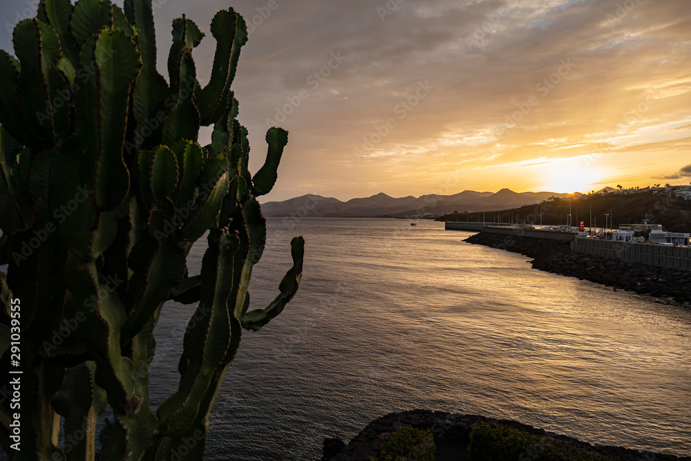 View of the port of Puerto del Carmen during sunset with a cactus in the foreground, Lanzarote, Spain