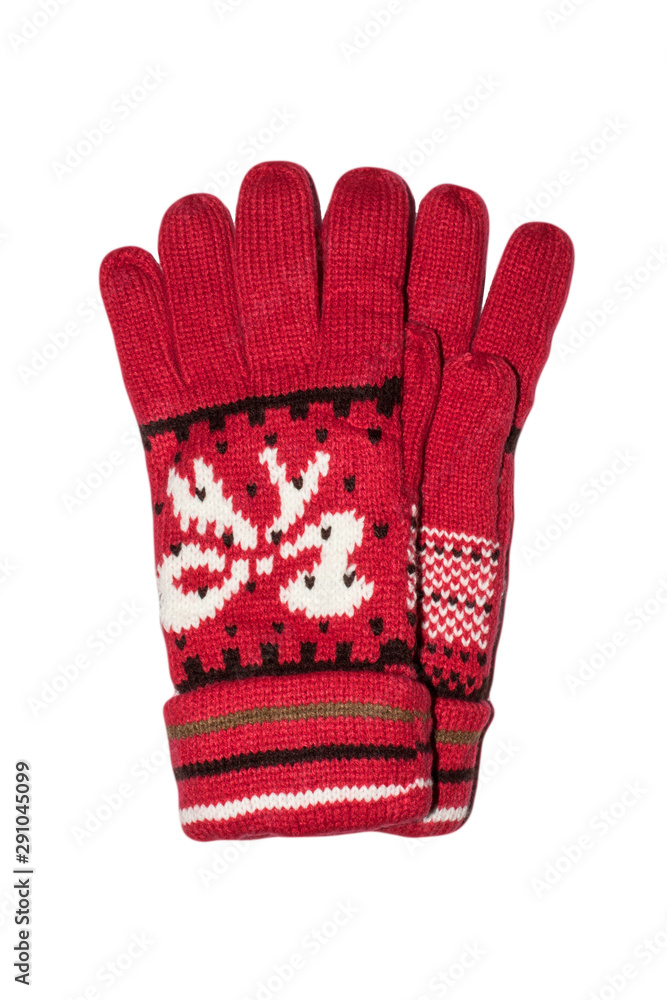 Knitted gloves with a pattern highlighted on a white background.Red knitted gloves.