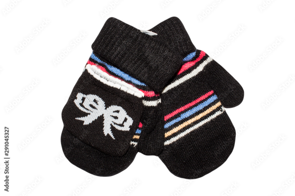 Children's knitted mittens on a white background.Knitted mittens with a pattern.