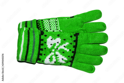 Knitted gloves with a pattern highlighted on a white background.Green knitted gloves.
