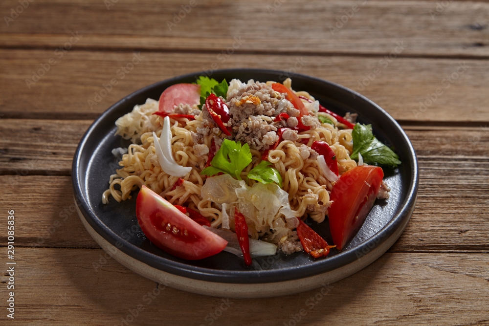 Spicy mama salad with pork on wood table,Spicy noodle.