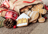 Christmas cookies in paper bag on wooden table
