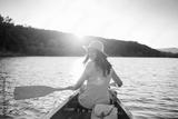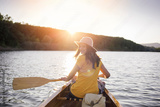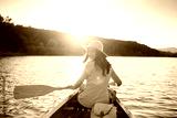 Smiling young woman paddling the canoe on the sunset lake. Enjoy canoeing, paddling, water sports