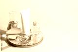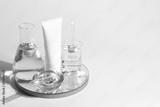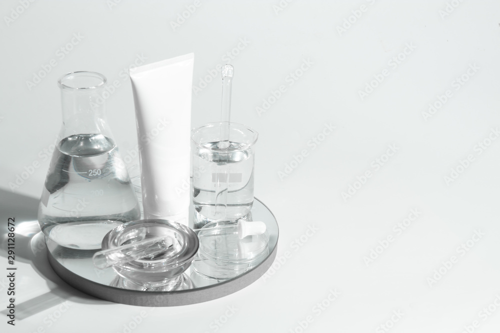 beauty spa medical skincare and cosmetic lotion bottle cream packaging product on white decor background and laboratory test glass tube in doctor healthy science concept