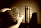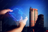 business girl with use device smartphone for digital technology social network internet online with cityscape background