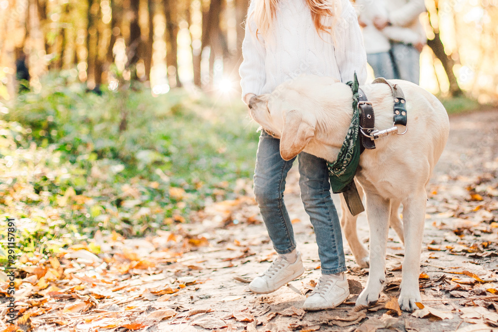 Little beautiful girl with dog labrador.