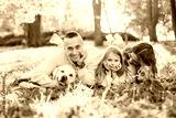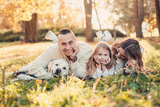 Happy family is having fun with dog labrador are lying on green grass in park.