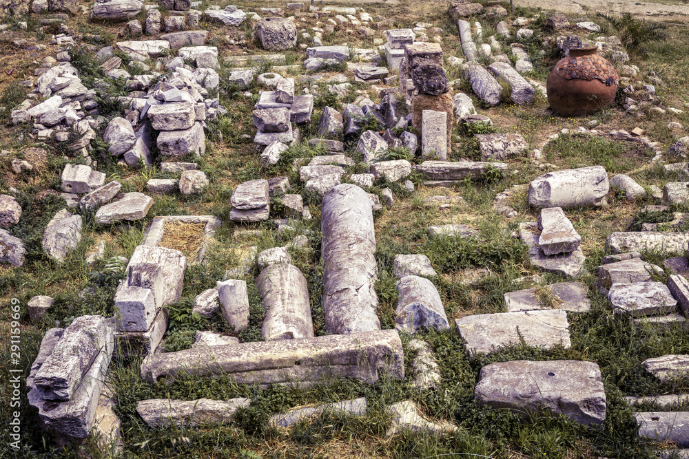Ancient ruins background, Athens, Greece. Panorama of classical Greek ruins in summer. Stone remains of architecture of famous antique culture. Scenic panorama of rocks from past civilization.