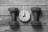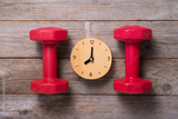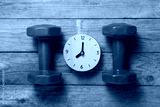 Time for exercising alarm clock and dumbbell on the wooden table background