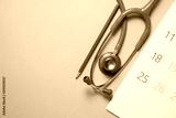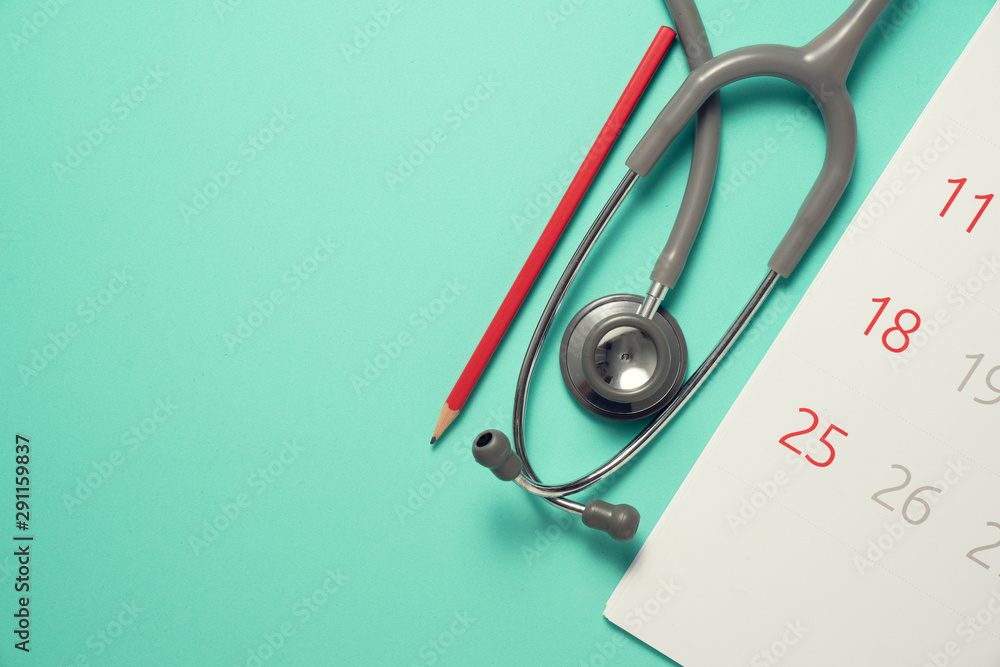Top view of stethoscope and calendar on the green background, schedule to check up healthy concept