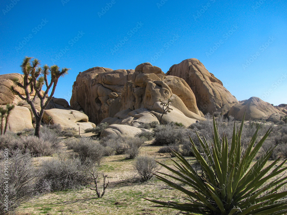 Granite monoliths and desert vegetation in afternoon light in Joshua Tree National Park, California