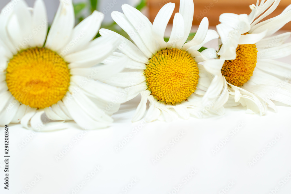 Beautiful camomile daisy flowers, medicinal herbs on white background with copy space
