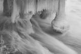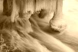 Ice formation and icicles under a jetty in fast streaming water, with long exposure.