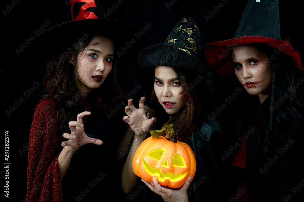 Young Asian people, a group of three women, in scary costumes. Group of friends wearing Halloween clothes preparing to join a party.