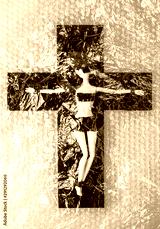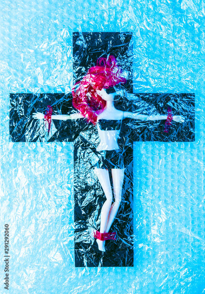 Synthetic life. Plastic doll crucified on a cross under cellophane film. Plastic pollution and social problems concept.