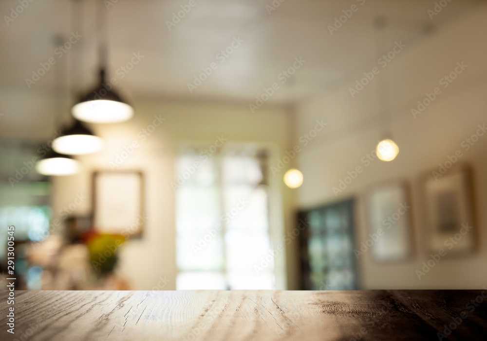 top of black wood table with blur interior of cafe lamp light and window in cozy sroom background