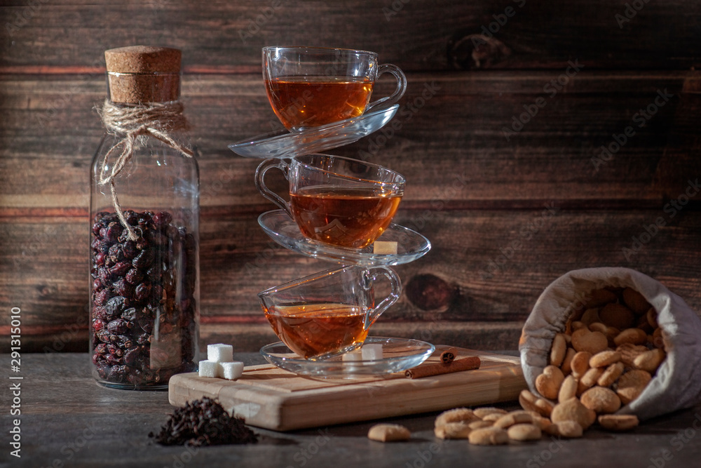 cups of tea stand on top of each other, balance of kitchen utensils, magic breakfast, selective focus