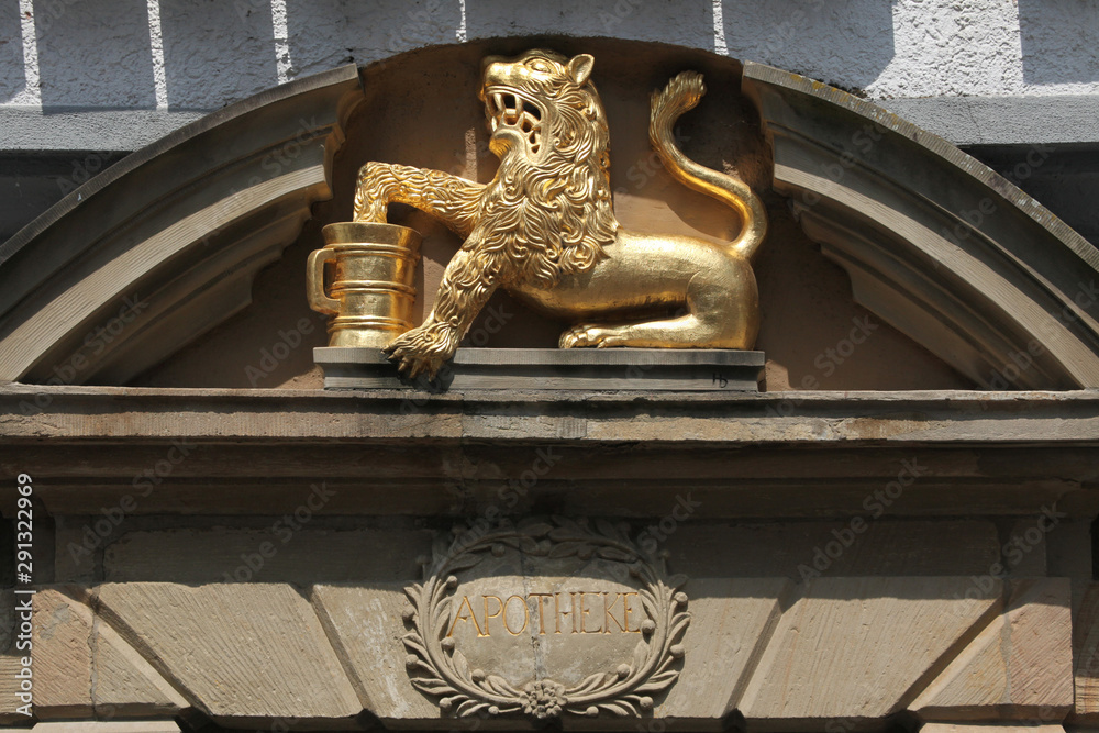 Traditional medieval pharmacy sign in Marbach am Neckar, Baden-Wurttemberg, Germany.