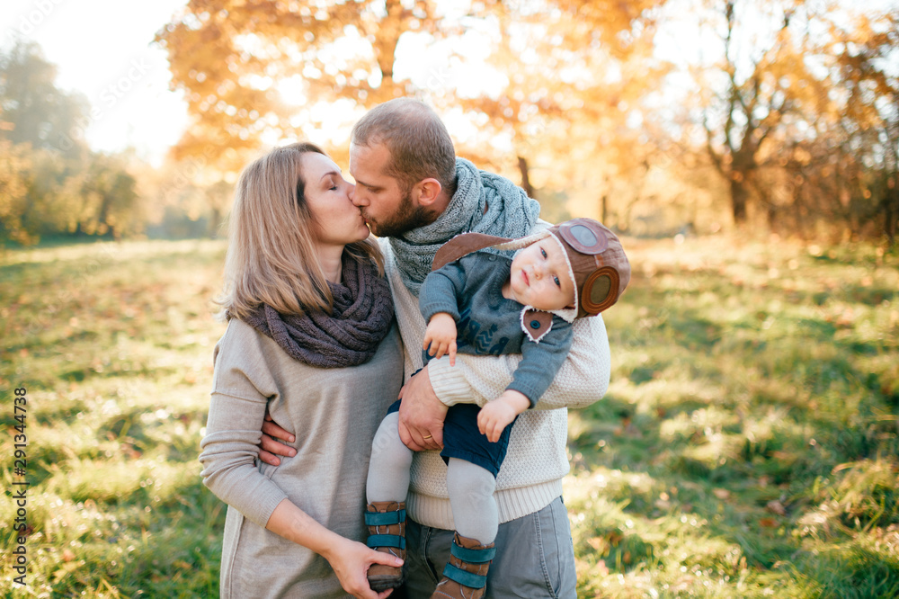 Stylish family couple hug funny child in pilot helmet and kissing in autumn park