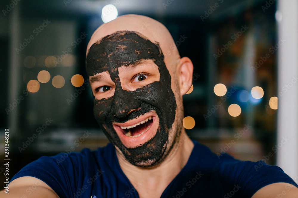 Man with charcoal mask on his face taking selfie on dark background with lights.