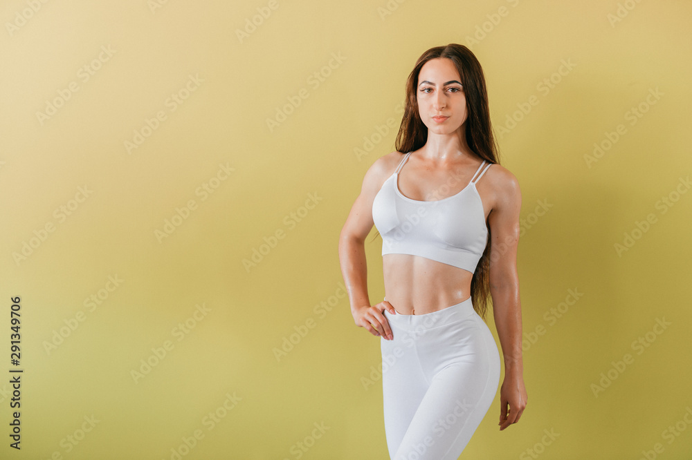 Portrait of athlete sexy girl in white sportswear posing in gym
