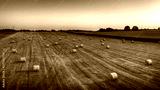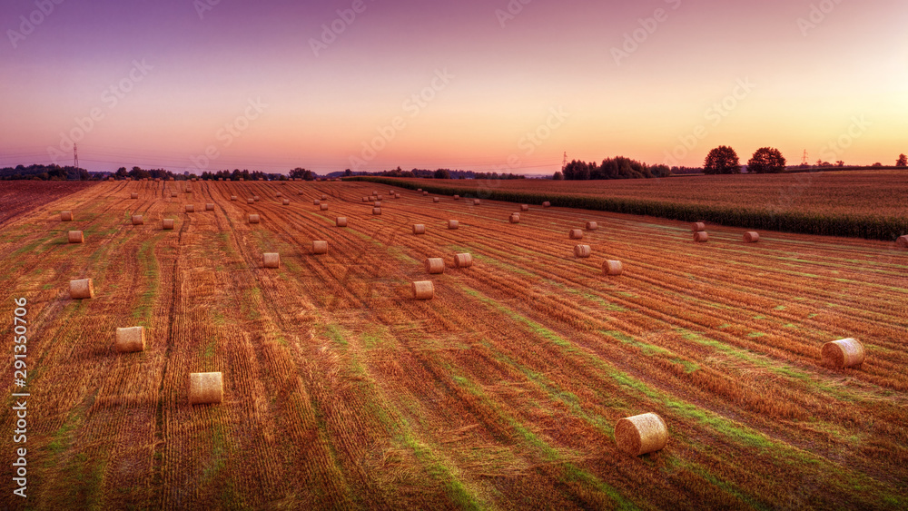 Field of stubble with haystacks early morning. August countryside landscape. Masuria, Poland.