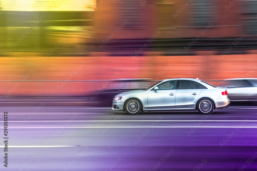 the car drives fast along a city street, overtakes other vehicles, blurred focus