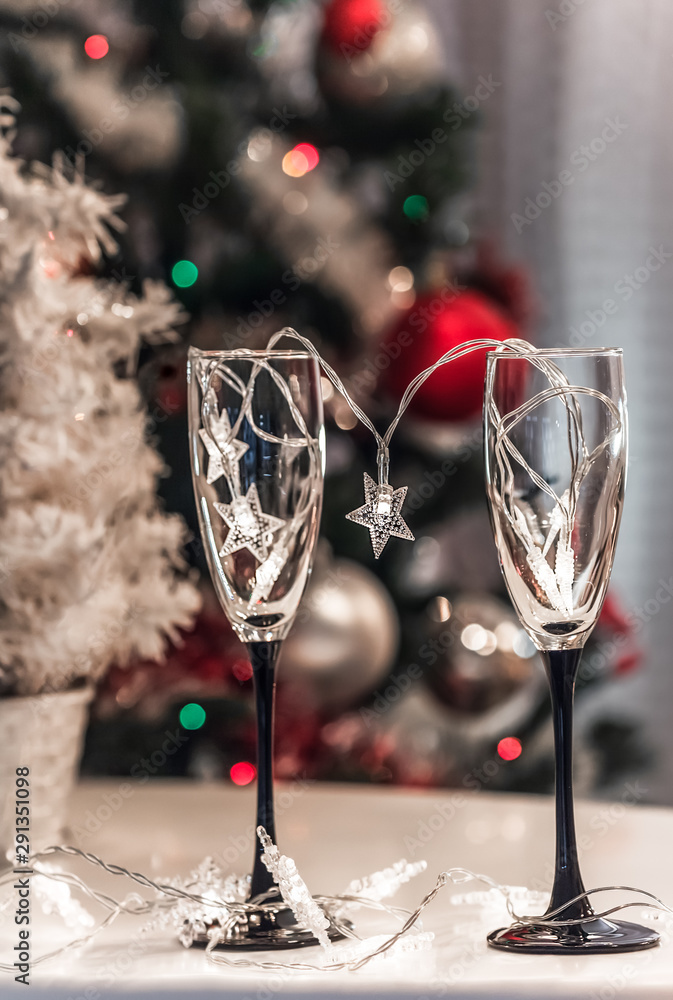 a pair of wine glasses against the background of the New Year tree and Christmas lights, a romantic date, selective focus