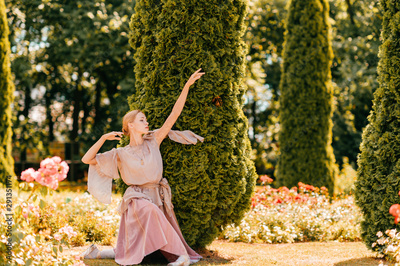 Young graceful female ballet dancer in theatrical dress posing in sunny park
