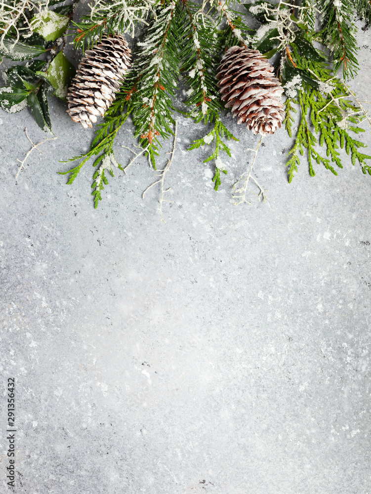 Christmas or winter background with a border of green and frosted evergreen branches and pine cones on a grey vintage board. Flat lay