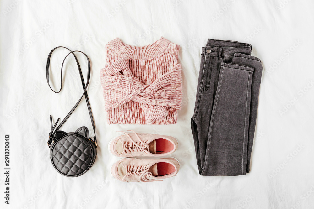 Pale pink warm sweater and gray trousers with sneakers, handbag on white sheet. Women's stylish autumn or winter outfit. Trendy clothes collage. Flat lay, top view.