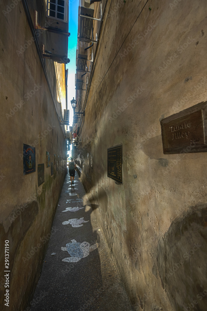 Woman Backpacker walks down narrow Turtle Alley in Kuala Terengganu Malaysia