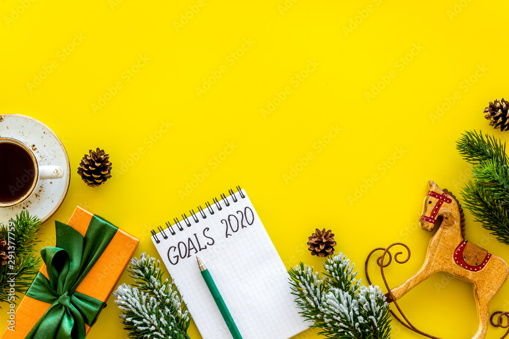 Planning New Year 2020. Notebook with goals on yellow background top view space for text