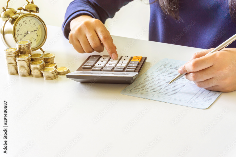 Women are calculating income on desk expenses on home office expenses. Calculating financial savings and economic concepts.