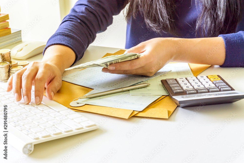 Women are calculating income on desk expenses on home office expenses. Calculating financial savings and economic concepts.