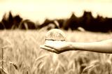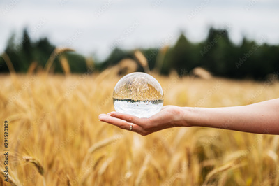 Female hand holding clear crystal ball with nature reflecting in it