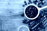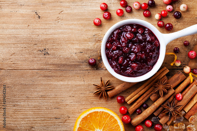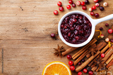 Cranberry sauce in ceramic saucepan with ingredients for cooking on kitchen wooden table top view.