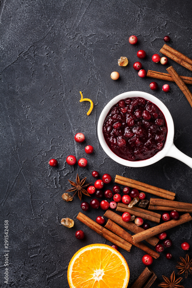 Cranberry sauce in ceramic saucepan with ingredients for cooking on stone black table top view.