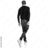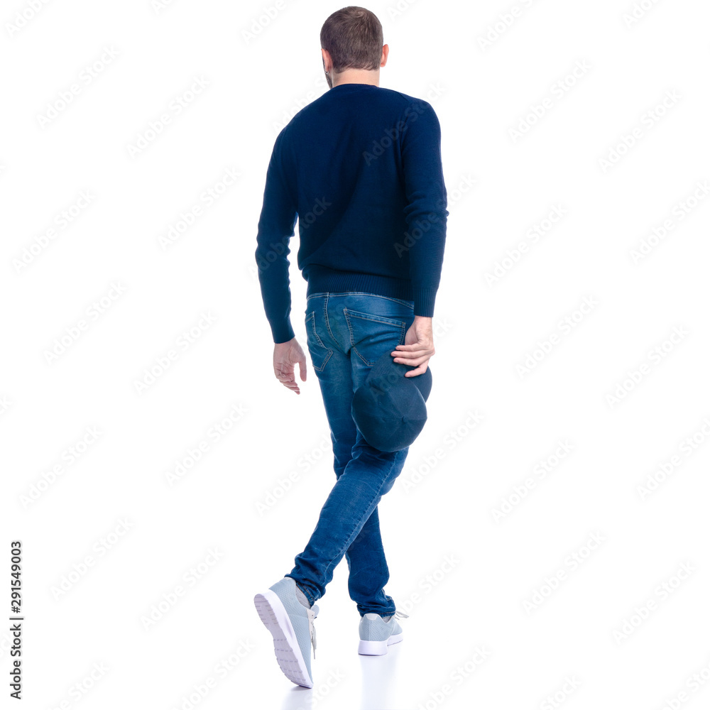 Man in jeans shorts, cap, casual clothing walking goes looking on white background isolation, rear view