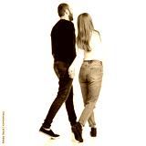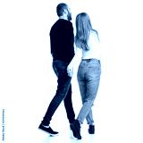 Young couple woman and man walking goes looking on white background isolation, rear view