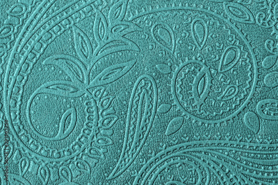Texture of genuine leather with embossed floral trend pattern close-up, green mint color, for wallpaper or banner design. For modern background