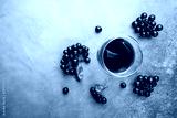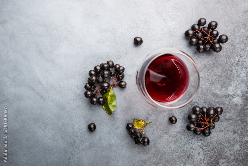 homemade black chokeberry wine or liqueur with ripe berries, top view