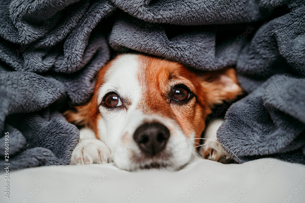 cute small jack russell dog lying on bed and covered into a grey blanket. Pets indoors at home