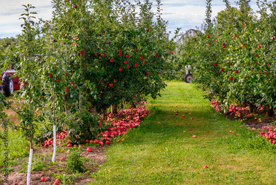 Autumn Apple trees at orchard ripe for picking