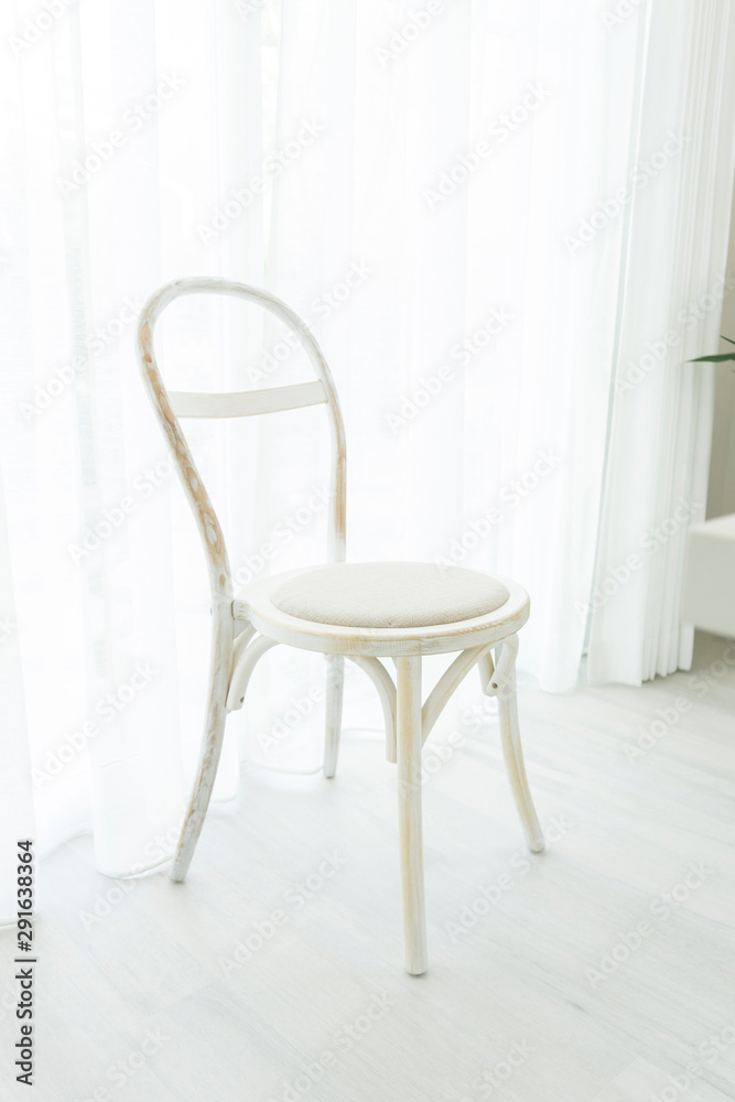 Vintage wood chair by the window with white curtain.