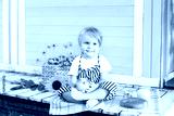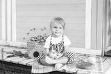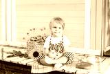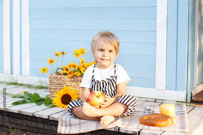 Little blond boy sitting on a wooden porch at home and eats an apple on an autumn day. Childhood concept. A child plays in the yard in the fall. Happy baby. Harvesting. Little farmer. Fruit and baby