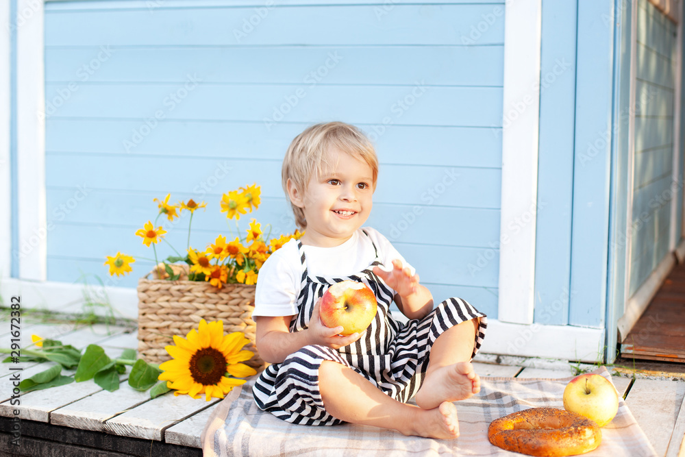 Little blond boy sitting on a wooden porch at home and eats an apple on an autumn day. Childhood concept. A child plays in the yard in the fall. Happy baby. Harvesting. Little farmer. Fruit and baby