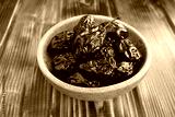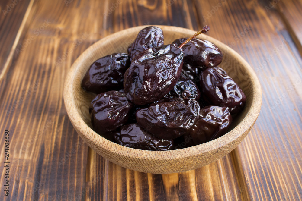 Pickled plums in the brown bowl on the wooden background. Fermented product.